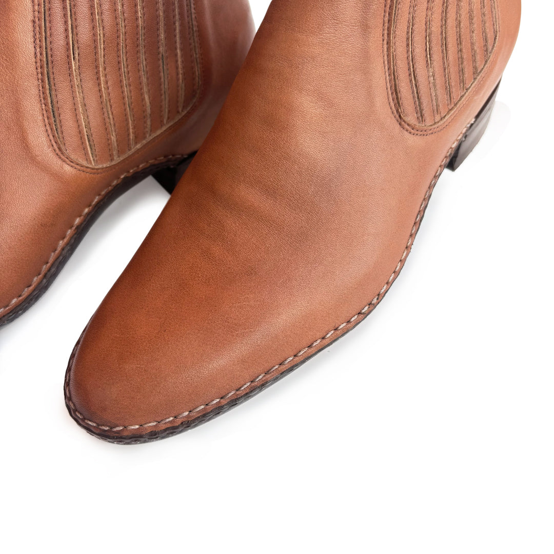 Botín De Charro Miel Quemado De Piel Artesanal Cosida A Mano El Botín con suela cosida a mano es la elección perfecta para quienes buscan un calzado que combine el estilo tradicional con una apariencia sofisticada y duradera. Este botín de horma punta charra, hecho a mano con piel 100%...